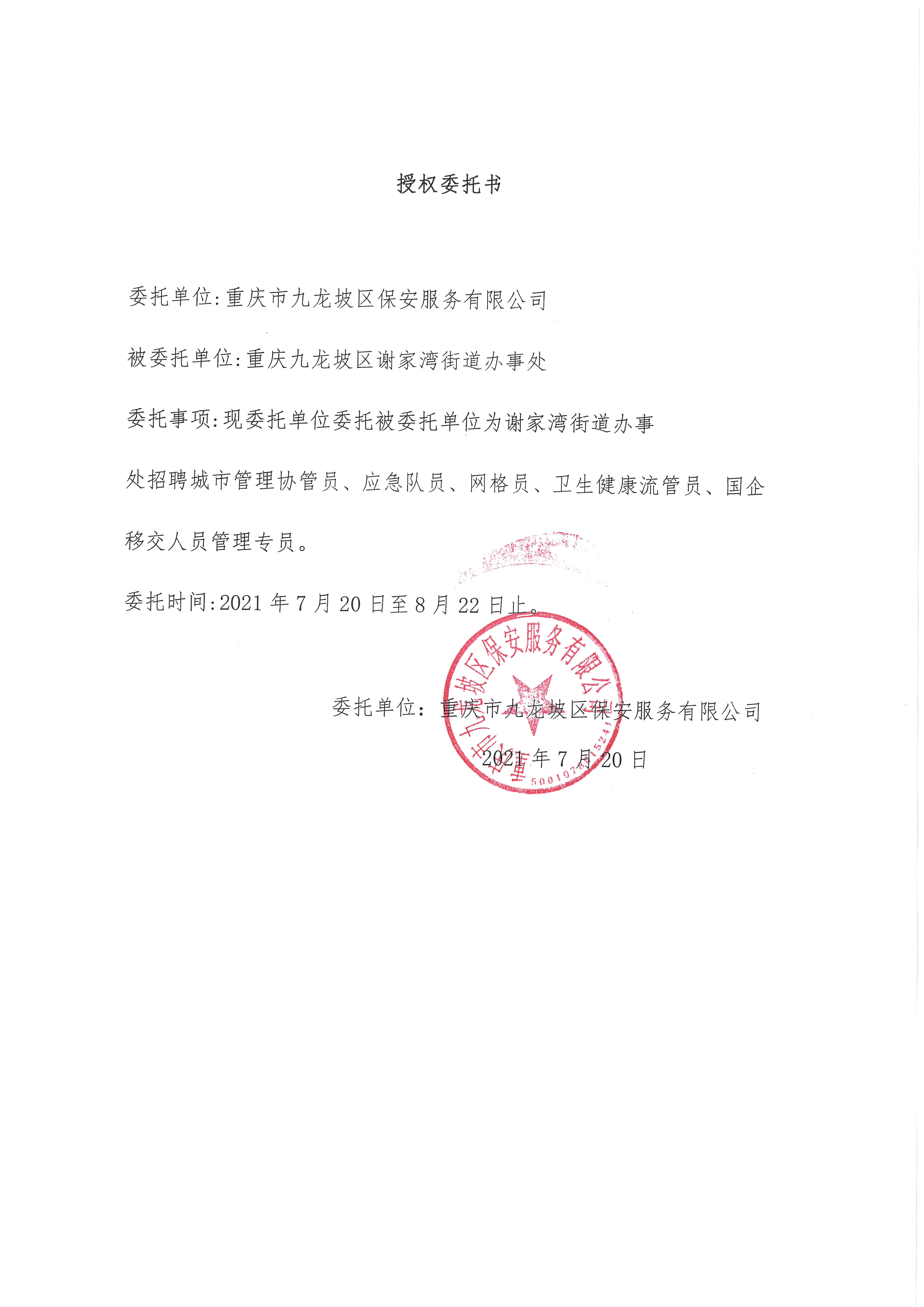 對(duì)體檢、政審合格的擬聘用人員進(jìn)行公示,公示期為5個(gè)工作日,公示無異議后,提交街道黨工委會(huì)議研究確定。擬聘用人員與第三方勞務(wù)公司重慶市九龍坡區(qū)保安服務(wù)有限公司簽訂勞動(dòng)合同,試用期2個(gè)月,試用期不合格的,解除聘用。