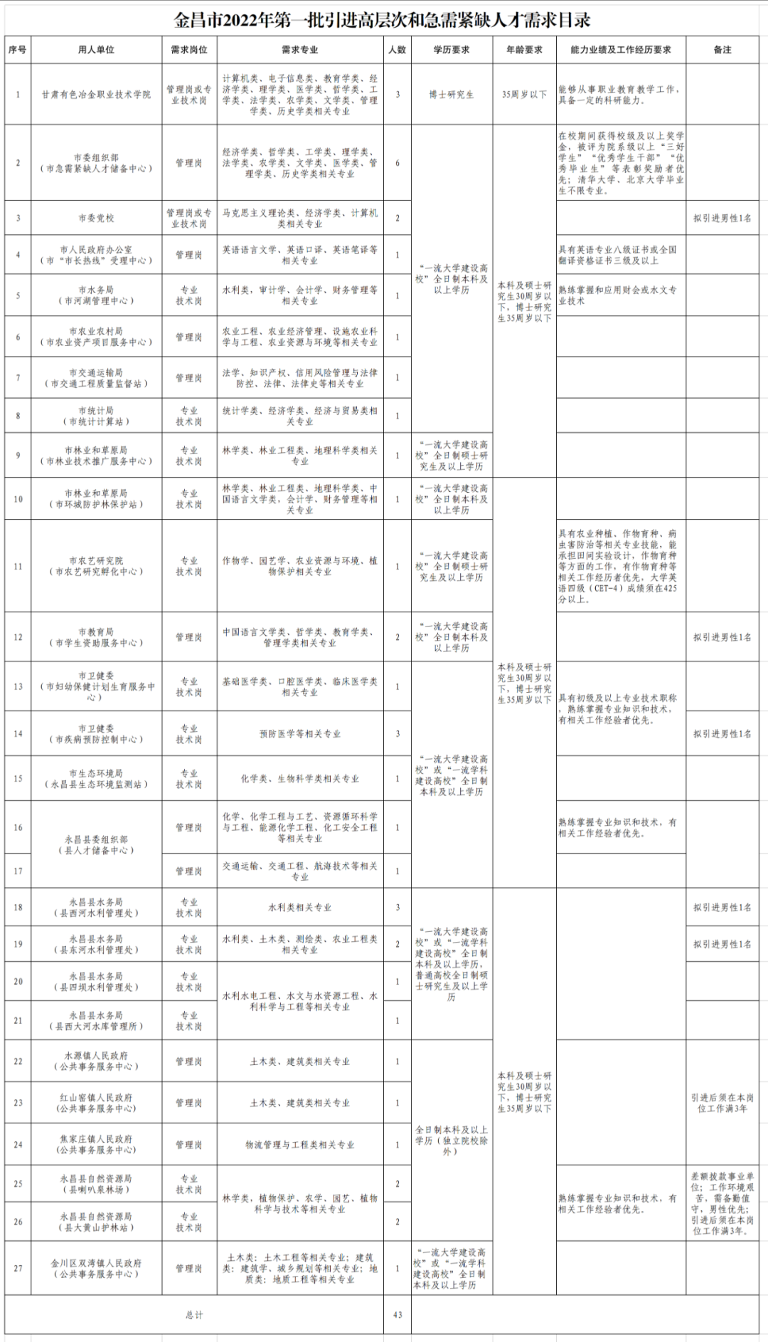 “一流大學(xué)建設(shè)高校”或“一流學(xué)科建設(shè)高校”全日制本科及以上學(xué)歷,且符合我市2022年高層次和急需緊缺人才專業(yè)需求條件的應(yīng)往屆畢業(yè)生(北京大學(xué)、清華大學(xué)畢業(yè)生及博士研究生可不受專業(yè)條件限制),共43名,其中市直26名,永昌縣16名,金川區(qū)1名(詳見《2022年金昌市第一批引進(jìn)高層次和急需緊缺人才需求目錄》)。對(duì)基層邊遠(yuǎn)地區(qū)和個(gè)別特殊緊缺的崗位適當(dāng)放寬畢業(yè)院校條件,各崗位招聘條件和要求以需求目錄為準(zhǔn)。