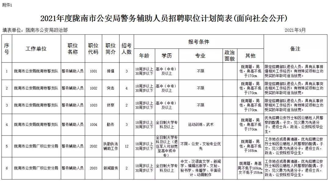 1、2021年度隴南市公安局警務(wù)輔助人員招聘職位計劃簡表(面向社會公開)