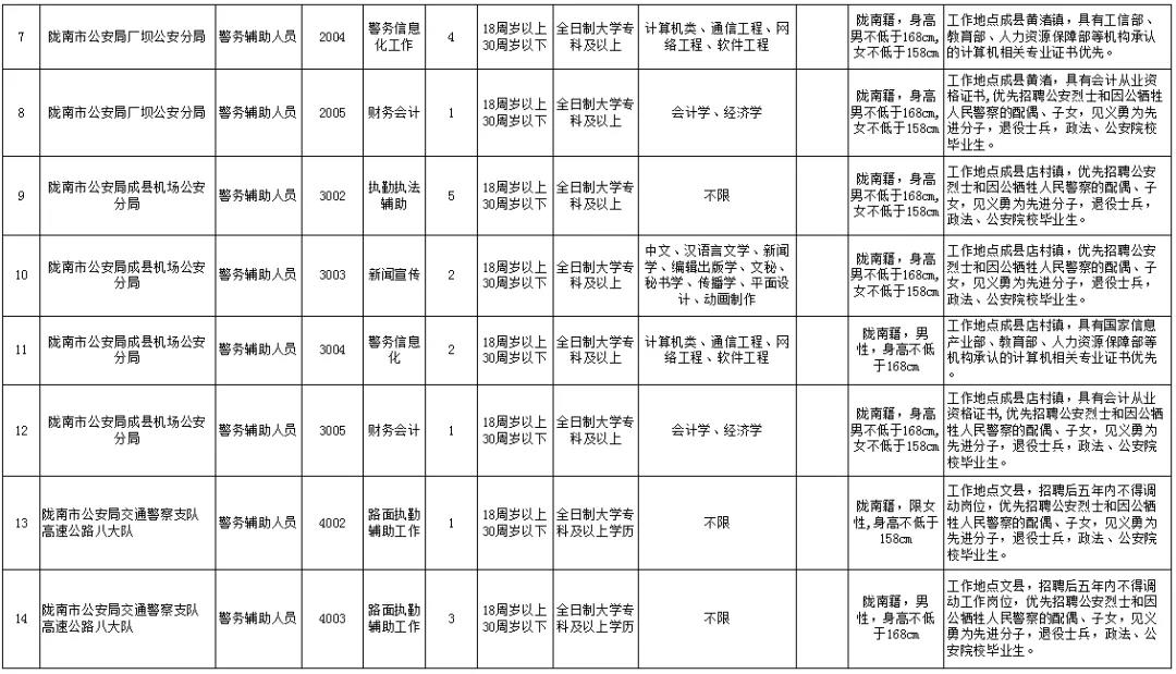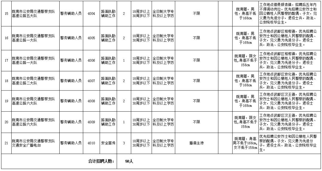 (一)隴南市公安局面向社會公開招聘警務(wù)輔助人員共58名,具體崗位如下: