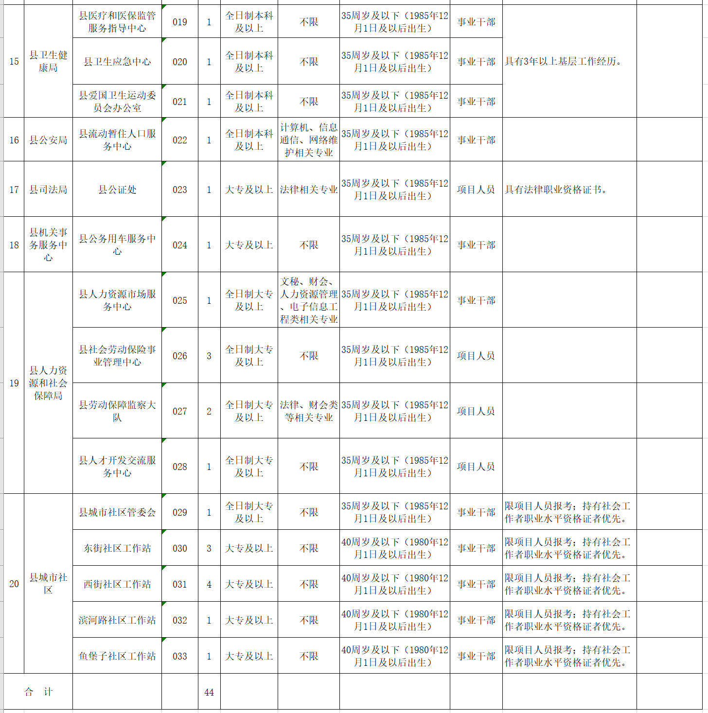計(jì)劃為縣政府決策咨詢服務(wù)中心等33個(gè)事業(yè)單位公開選調(diào)工作人員44人(詳見附件1)。其中事業(yè)干部31人,項(xiàng)目人員13人。