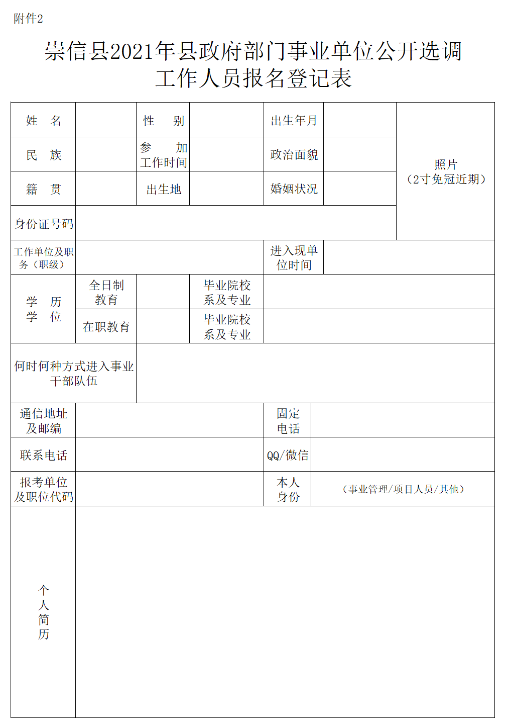 2.崇信縣2021年縣政府部門事業(yè)單位公開選調(diào)工作人員報(bào)名登記表