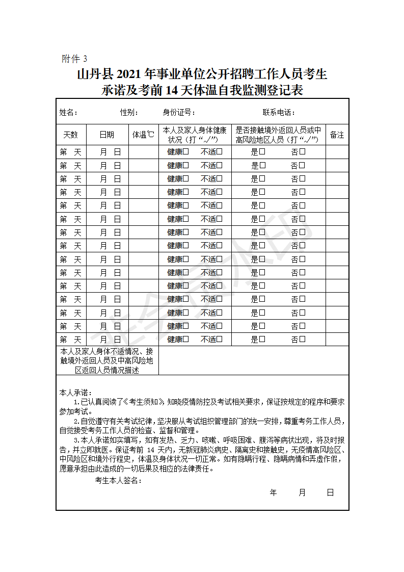 附件下載:附件3:山丹縣2021年事業(yè)單位公開招聘工作人員考生承諾及考前14天體溫自我監(jiān)測登記表.docx