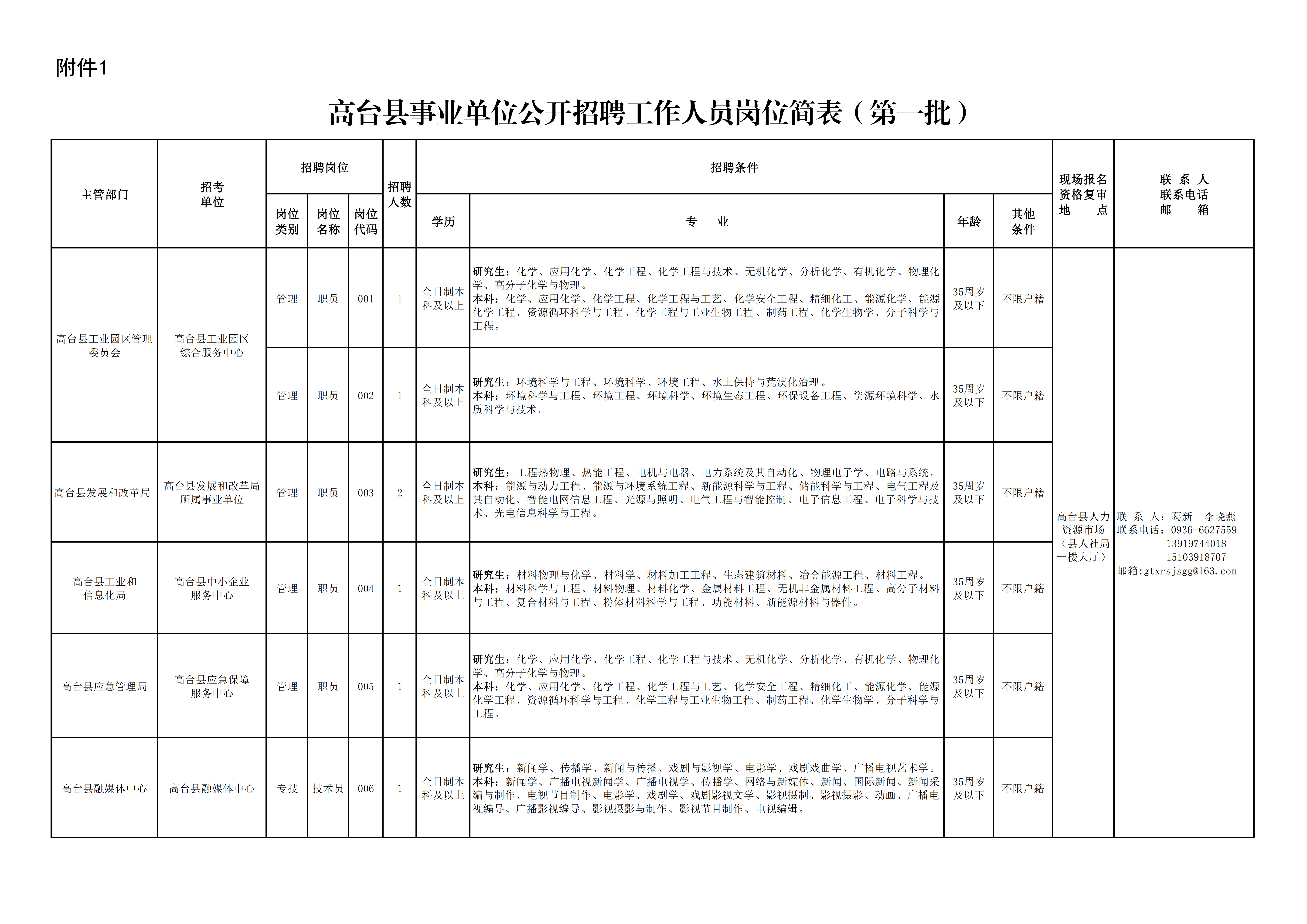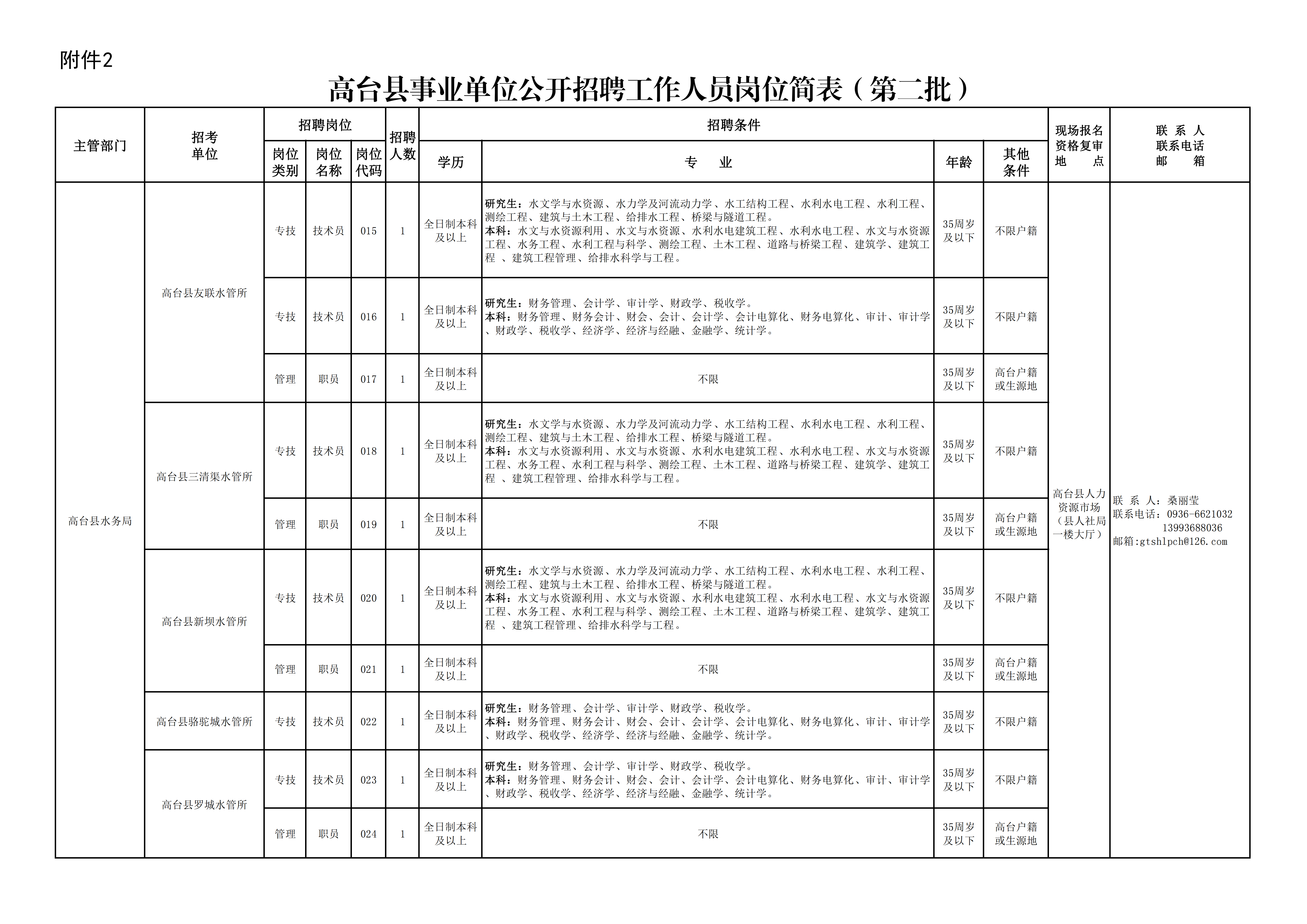 6.具備招聘崗位要求的其他條件,詳見《高臺縣事業(yè)單位公開招聘工作人員崗位簡表》(附件1、附件2,以下簡稱《崗位簡表》)。