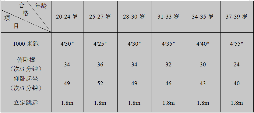 考生以上四個(gè)項(xiàng)目,如有一項(xiàng)未達(dá)到合格(60分)標(biāo)準(zhǔn)的,不得進(jìn)入面試環(huán)節(jié)。各測(cè)試項(xiàng)目合格標(biāo)準(zhǔn)見(jiàn)下表: