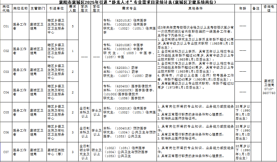 2025-06-06 14:42:00閱讀()襄陽市衛(wèi)生健康委員會(huì)襄陽市襄城區(qū)2025年度計(jì)劃引進(jìn)“臥龍人才”91名。其中,C類崗位為優(yōu)秀醫(yī)務(wù)工作者引才,共引進(jìn)18名。其中,C01-C04崗面向湖北省內(nèi)在職在編、專業(yè)技術(shù)精湛的一線醫(yī)務(wù)工作者,引進(jìn)10名;C05-C06崗面向普通高校全日制本科及以上學(xué)歷畢業(yè)生,并取得相應(yīng)學(xué)歷學(xué)位,同時(shí)需取得執(zhí)業(yè)醫(yī)師資格證書,引進(jìn)5名;C07崗面向國內(nèi)普通高?;蚝M庵咝H罩拼T士研究生及以上學(xué)歷的應(yīng)屆、往屆畢業(yè)生,引進(jìn)3名。