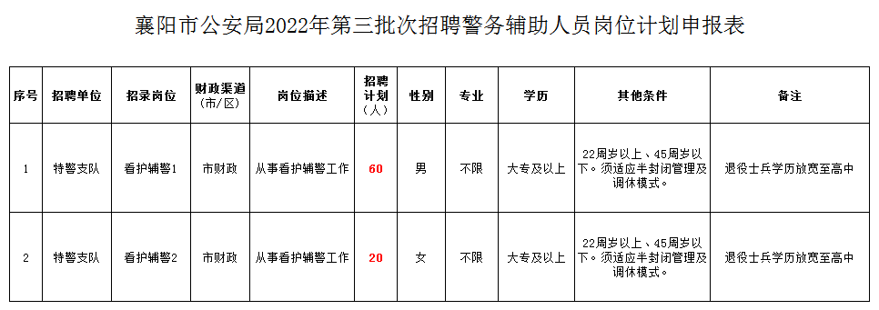 招聘計(jì)劃本次公開招聘看護(hù)輔警80名,男性60名、女性20名。具體如下: