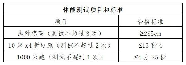 體能測評時間以通知為準(zhǔn)。體能測評項(xiàng)目為縱跳摸高、10米×4往返跑,1000米跑順序進(jìn)行。三項(xiàng)測試其中兩項(xiàng)通過者視為合格,發(fā)放筆試準(zhǔn)考證。