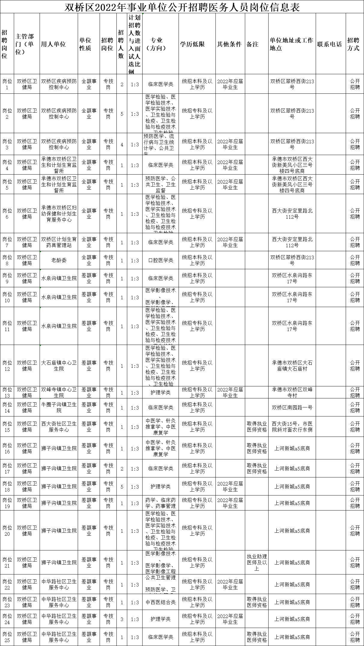 3統(tǒng)招碩士研究生學(xué)歷不限戶籍;(具體崗位要求詳見《雙橋區(qū)2022年公開招聘事業(yè)單位醫(yī)務(wù)人員崗位信息表》);