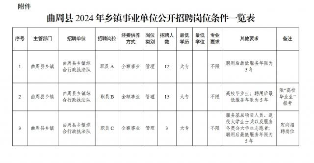 本次招聘崗位為曲周縣鄉(xiāng)鎮(zhèn)全額事業(yè)編制工作人員30名,其中,限“高校畢業(yè)生”報(bào)考崗位15名,定向招聘崗位3名。招聘人數(shù)、具體崗位、資格條件詳見《曲周縣2024年鄉(xiāng)鎮(zhèn)事業(yè)單位公開招聘崗位條件一覽表》。