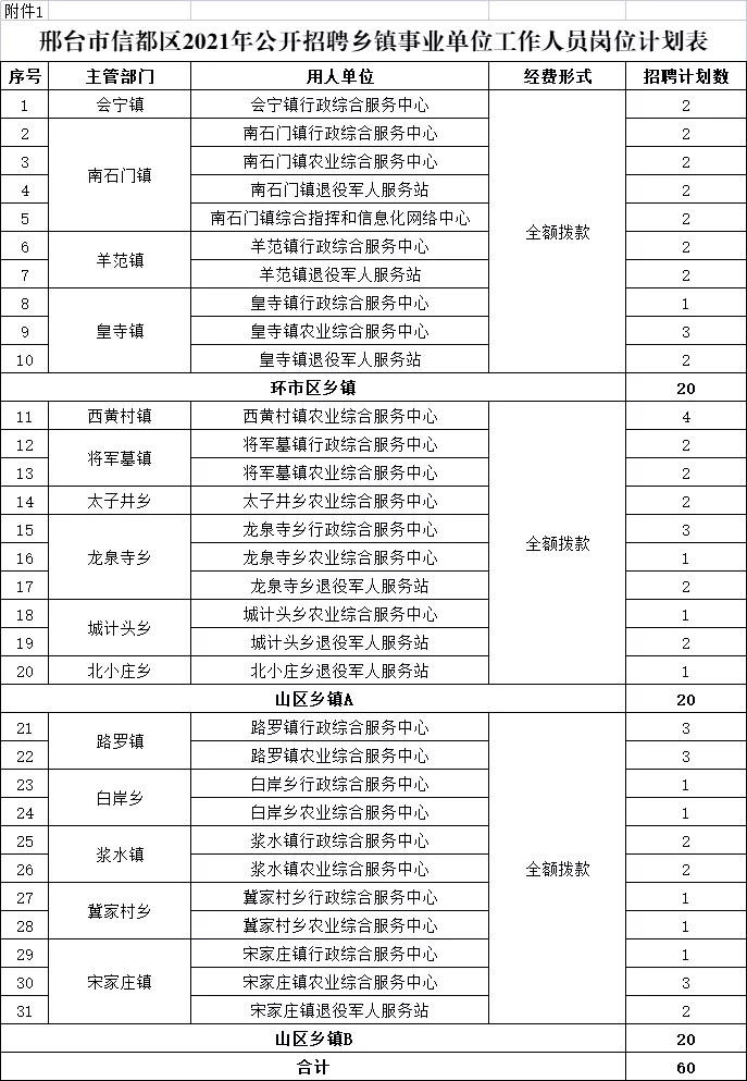 本次招聘鄉(xiāng)鎮(zhèn)事業(yè)單位工作人員共60名(全額事業(yè)編制),具體崗位計劃詳見《邢臺市信都區(qū)2021年公開招聘鄉(xiāng)鎮(zhèn)事業(yè)單位工作人員崗位計劃表》(附件1)。