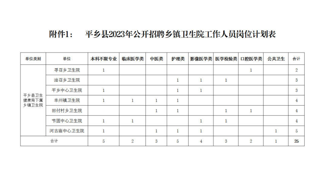 公開招聘鄉(xiāng)鎮(zhèn)衛(wèi)生院工作人員25名。其中:管理崗5名,專技崗20名。詳見《平鄉(xiāng)縣2023年公開招聘鄉(xiāng)鎮(zhèn)衛(wèi)生院工作人員崗位計劃表》(附件1),《平鄉(xiāng)縣2023年公開招聘鄉(xiāng)鎮(zhèn)衛(wèi)生院工作人員崗位信息表》(附件2)。