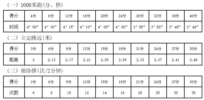 測試科目為1000米跑、立定跳遠、俯臥撐,總成績100分。
