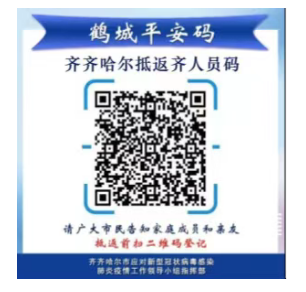 凡近期在市域外抵返齊齊哈爾人員,抵返前2天主動報備,在進入齊齊哈爾市市域前,要使用手機掃描“齊齊哈爾抵返齊人員碼”,點擊進入程序后,按照注冊內(nèi)容要求,如實完整填寫相關(guān)信息。抵返后12小時內(nèi)主動報告,24小時內(nèi)盡早主動接受第一次核酸檢測并配合落實分類管控措施。