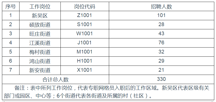 本次招聘專職網(wǎng)格員共330名,具體崗位分配如下: