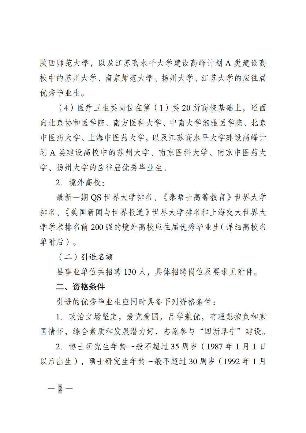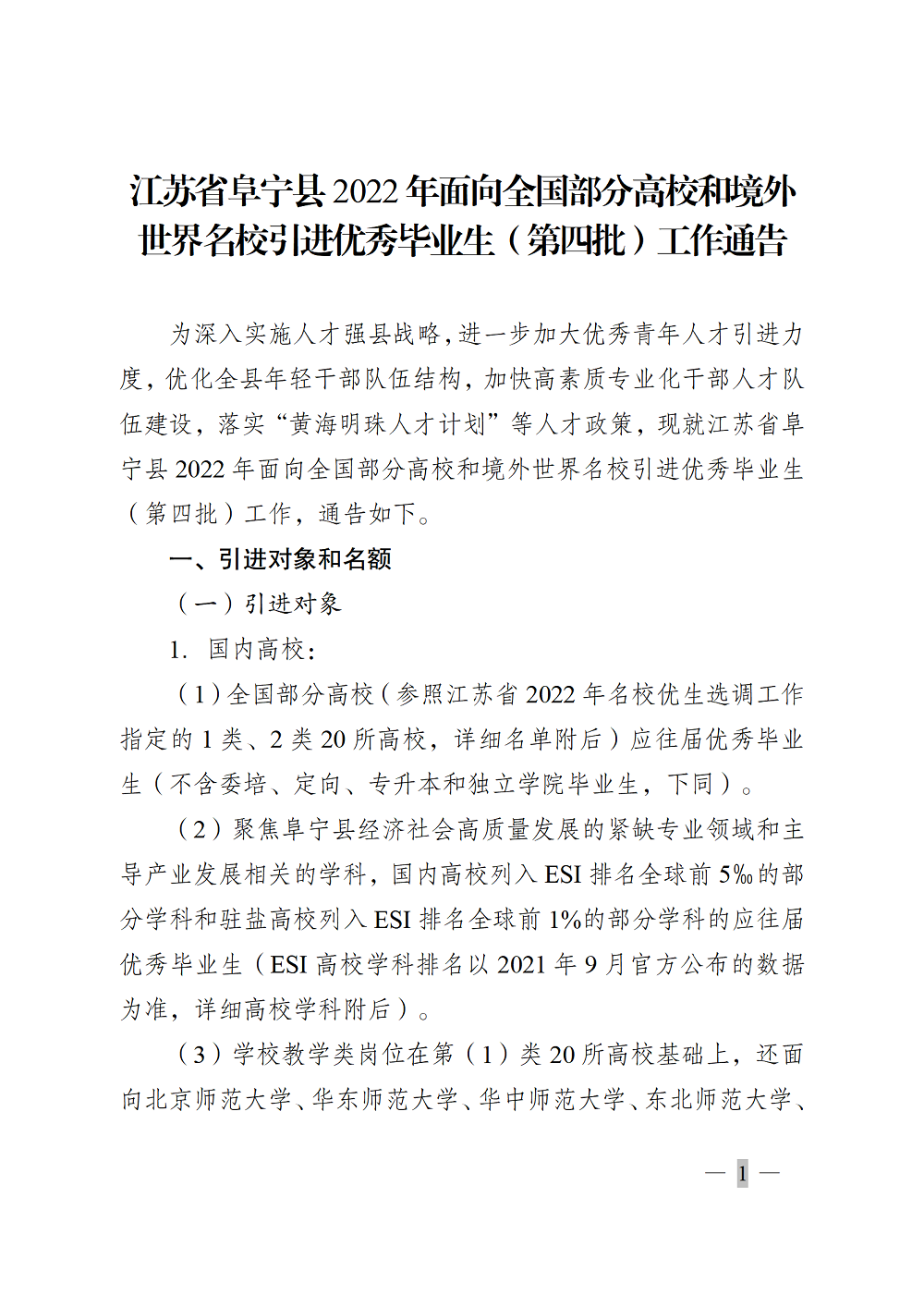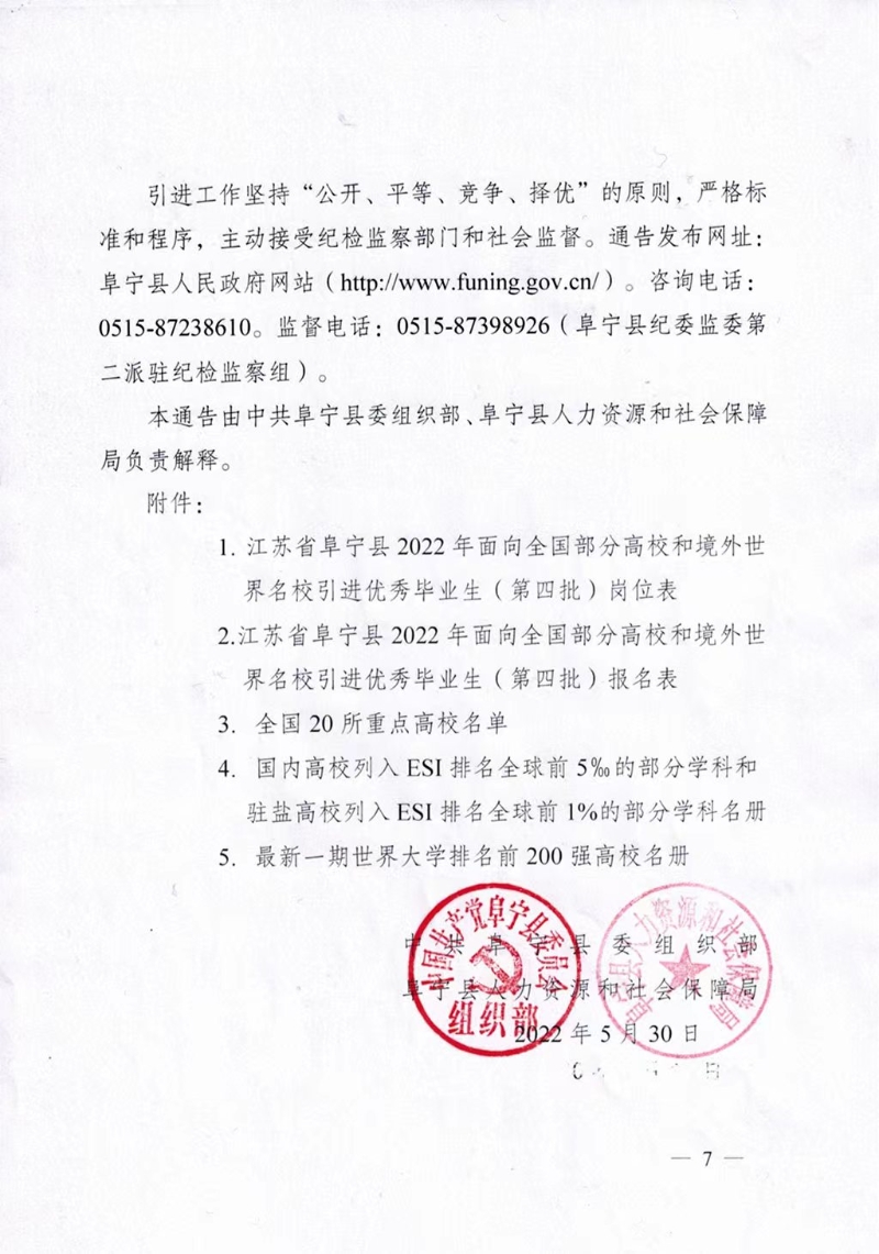 2022年鹽城阜寧縣面向全國(guó)部分高校和境外世界名校引進(jìn)優(yōu)秀畢業(yè)生(第四批)工作通告
