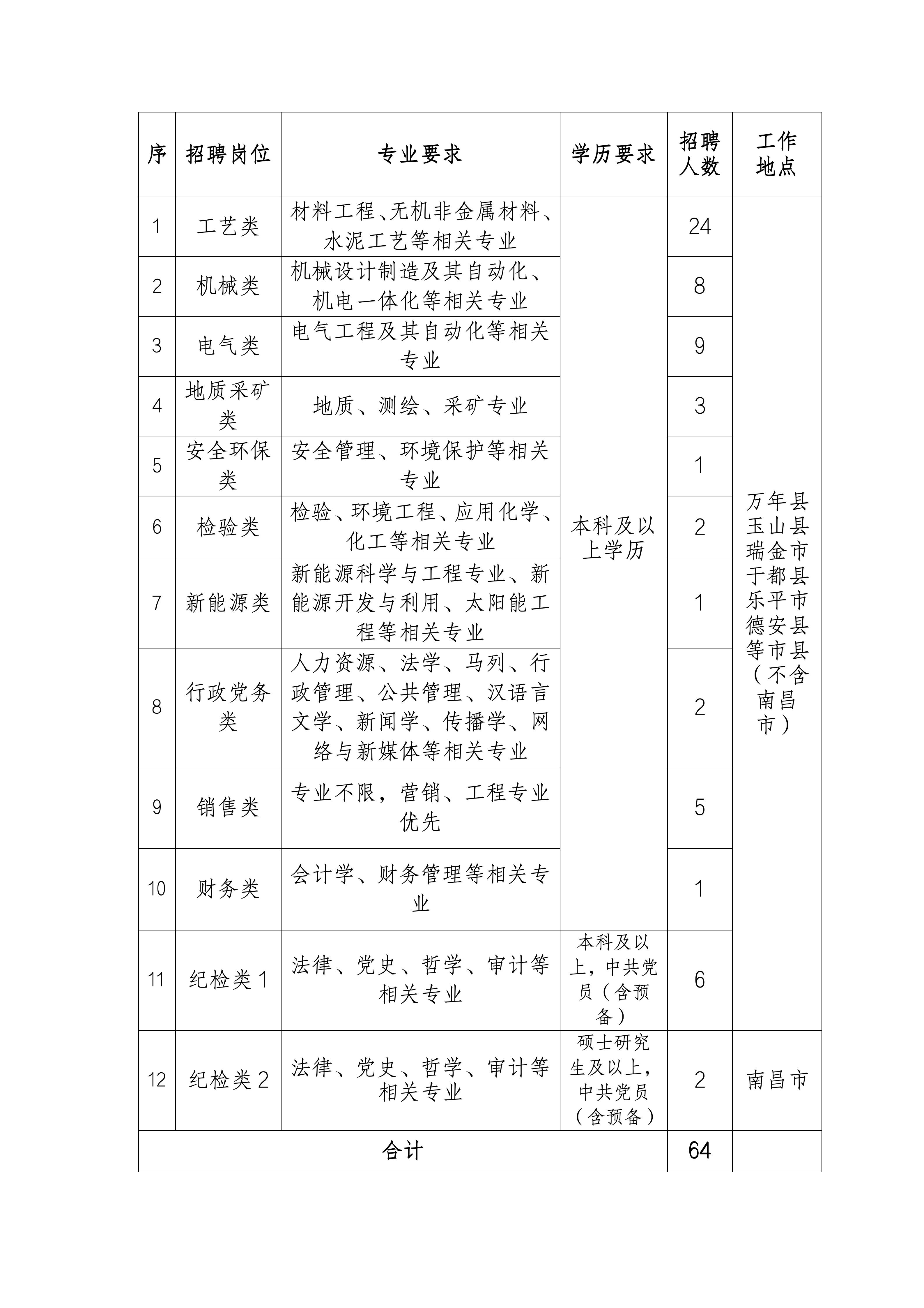 為滿足公司的生產(chǎn)經(jīng)營需求,面向社會(huì)公開招聘,本次招聘崗位類別12個(gè),招聘人數(shù)共計(jì)64人,人員分配到江西省內(nèi)下屬各生產(chǎn)基地。