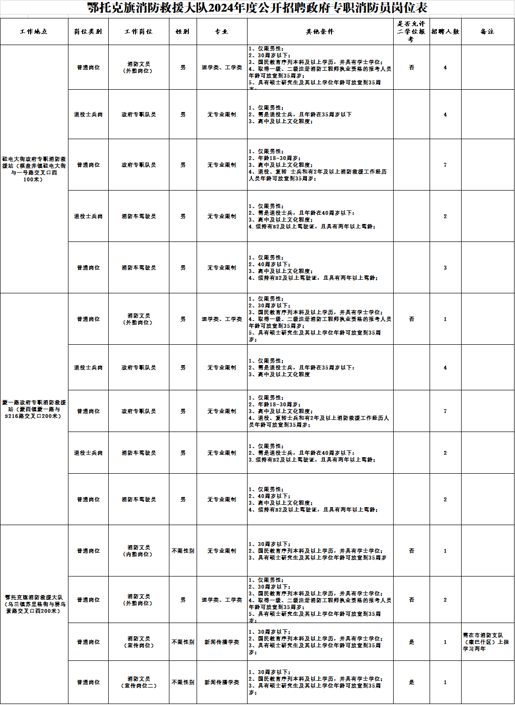 烏蘭鎮(zhèn)共計(jì)5人,均為消防文員,其中外勤2人,內(nèi)勤3人;棋盤井鎮(zhèn)共計(jì)20人,其中消防文員4人,政府專職消防隊(duì)員11人,消防車駕駛員5人;蒙西鎮(zhèn)共計(jì)16人,其中消防文員1人,政府專職消防隊(duì)員11人,消防車駕駛員4人;具體崗位要求詳見《鄂托克旗消防救援大隊(duì)2024年度公開招錄政府專職消防員崗位信息表》(附件1)。