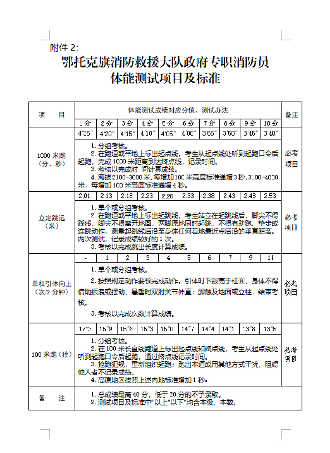 按照《鄂托克旗消防救援大隊(duì)政府專職消防員體能測試項(xiàng)目及標(biāo)準(zhǔn)》(附件2)執(zhí)行。參加體能測試人員要在考前簽訂《鄂托克旗消防救援大隊(duì)政府專職消防員招錄體能測試承諾書》(附件3),體能測試實(shí)行量化評(píng)分,滿分40分。測試結(jié)束后按人員綜合成績排名順序,按一定比例確定人選。如單項(xiàng)多人達(dá)到滿分以上成績,按照項(xiàng)目的分類,依據(jù)耗時(shí)短、距離長、數(shù)量多等原則進(jìn)行排名。測試分組由現(xiàn)場抽簽決定,全程錄像拍攝,當(dāng)場公布成績。另本次體能測試設(shè)置合格線,四項(xiàng)分?jǐn)?shù)低于20分的不予進(jìn)行錄、補(bǔ)用。