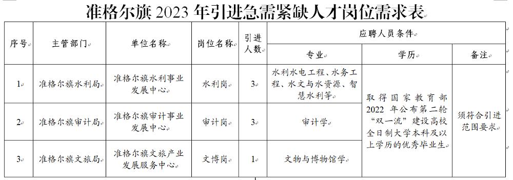 2023-12-13 10:17:04閱讀()準(zhǔn)格爾旗人民政府根據(jù)《鄂爾多斯市關(guān)于加強(qiáng)新時(shí)代人才工作助推高質(zhì)量發(fā)展的若干政策》(鄂黨發(fā)〔2021〕12號(hào))《準(zhǔn)格爾旗關(guān)于深化人才發(fā)展體制機(jī)制改革的若干政策》(準(zhǔn)黨辦發(fā)〔2020〕2號(hào))精神,為進(jìn)一步優(yōu)化干部隊(duì)伍結(jié)構(gòu),更好地服務(wù)準(zhǔn)格爾旗各項(xiàng)事業(yè)高質(zhì)量發(fā)展,現(xiàn)計(jì)劃為水利事業(yè)發(fā)展中心、審計(jì)事業(yè)發(fā)展中心、文旅產(chǎn)業(yè)發(fā)展服務(wù)中心3家事業(yè)單位引進(jìn)急需緊缺人才,具體事宜如下: