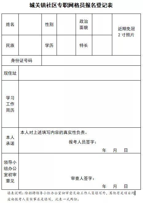 1.《城關(guān)鎮(zhèn)社區(qū)專職網(wǎng)格員報(bào)名登記表》一式二份;