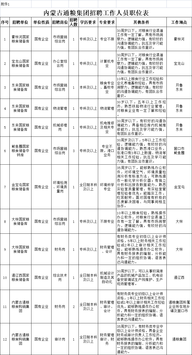 附件1: 內蒙古通糧集團招聘工作人員職位表