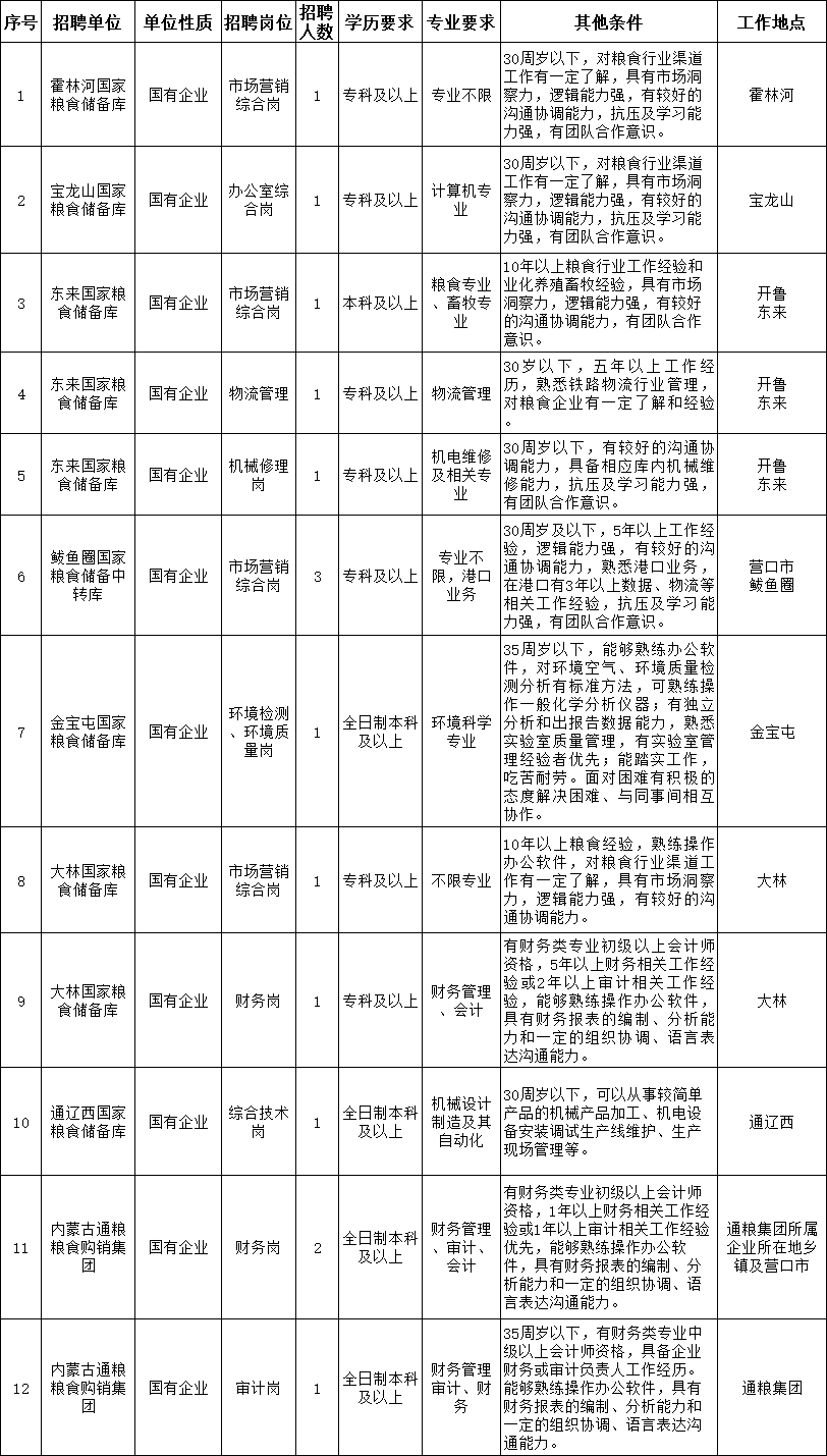 2022-08-10 17:56:51閱讀()內蒙古通糧集團內蒙古通糧糧食購銷集團有限公司(簡稱“通糧集團”)通糧集團是通遼地區(qū)唯一的市政府直屬公益類國有獨資糧食企業(yè)集團。公司注冊資本金1.15億元人民幣,現(xiàn)有資產(chǎn)16.15億元,凈資產(chǎn)3.76億元。主要經(jīng)營范圍為糧食購銷,種植;糧食收儲;裝卸;貨物運輸代理、其他運輸代理業(yè);銷售種子、化肥、農(nóng)藥、日用百貨、預包裝食品、散裝食品;農(nóng)牧業(yè)信息服務;成品糧加工銷售;普通道路貨物運輸;場地、庫房租賃;農(nóng)業(yè)技術研發(fā);養(yǎng)殖;自營和代理各類商品和技術的進出口,糧食相關產(chǎn)業(yè)產(chǎn)品的研發(fā);貨物監(jiān)管。根據(jù)業(yè)務發(fā)展需要,現(xiàn)面向社會公開招聘,具體事宜公告如下: