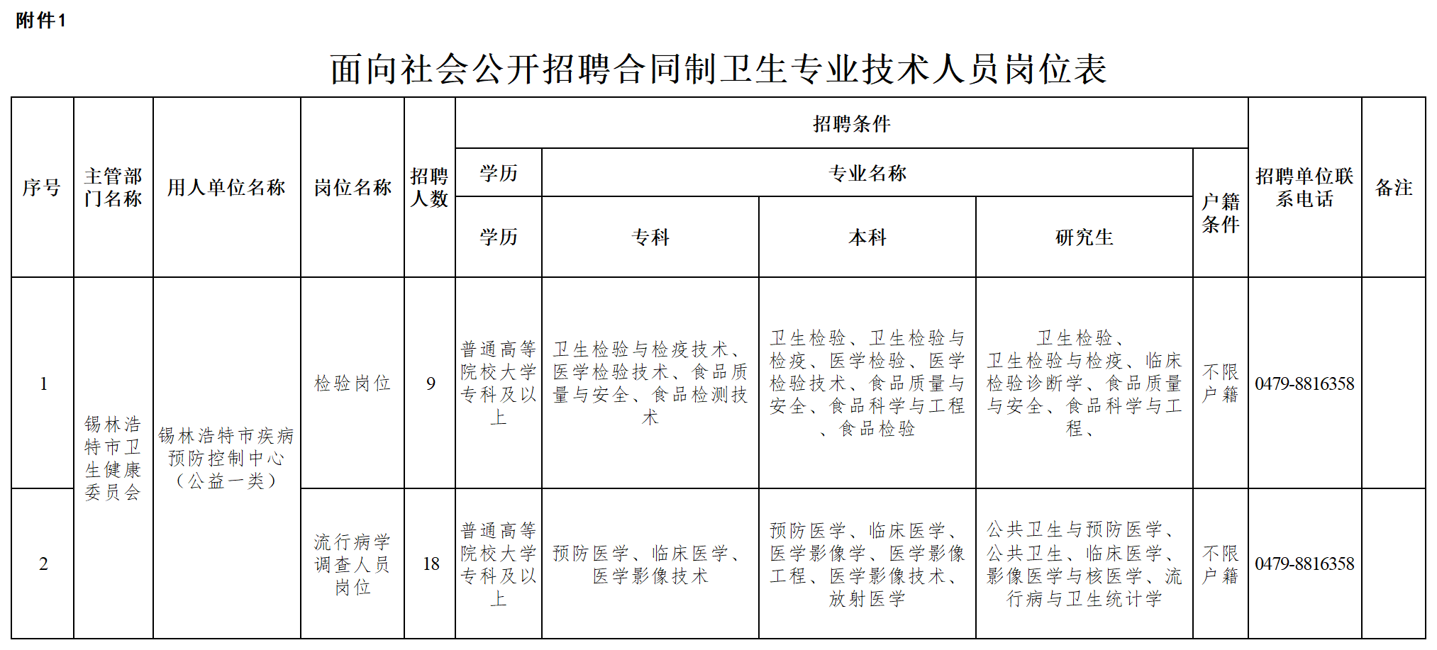 本次錫林浩特市疾病預(yù)防控制中心面向社會公開招聘合同制衛(wèi)生專業(yè)技術(shù)人員27人(其中:檢驗崗位9人、流行病學調(diào)查人員崗位18人)詳見附件1。