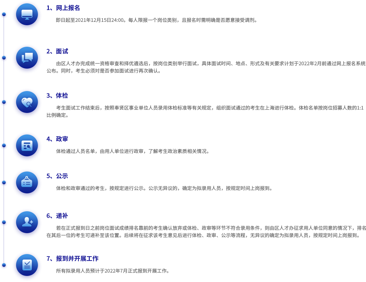 1.選調(diào)生結(jié)合儲備人才項目同步開展,統(tǒng)一采取網(wǎng)上報名,網(wǎng)上報名時間截止到2021年11月10日24:00。 2.在規(guī)定時間內(nèi)成功報名“奉賢區(qū)定向選調(diào)生”的人員,經(jīng)奉賢區(qū)委組織部綜合遴選后,按一定比例擇優(yōu)推薦參加上海市定向選調(diào)考試,與上海市2022年度考試錄用公務(wù)員筆試一并進行(一考兩用,即筆試成績可同時在選調(diào)生招錄和上海市2022年度考試錄用公務(wù)員中使用)。 3.經(jīng)上海市選調(diào)生筆試、面試、體檢、考察、公示、錄用等相關(guān)程序后,辦理選調(diào)生公務(wù)員錄用手續(xù)。錄用職位根據(jù)人崗相適原則,由區(qū)委組織部統(tǒng)一安排。 4.選調(diào)生正式錄用后,區(qū)委組織部負責(zé)安排選調(diào)生進行為期兩年的基層培養(yǎng)鍛煉(其中第一年為試用期),按照大學(xué)生村官進行管理。試用期滿考核合格的,按照相關(guān)規(guī)定進行轉(zhuǎn)正定級;不合格的,將取消錄用。 5.報名參加選調(diào)的應(yīng)屆畢業(yè)生,應(yīng)如實填報個人信息、提供任職和獲獎證明材料。凡弄虛作假的,一律取消選調(diào)資格。