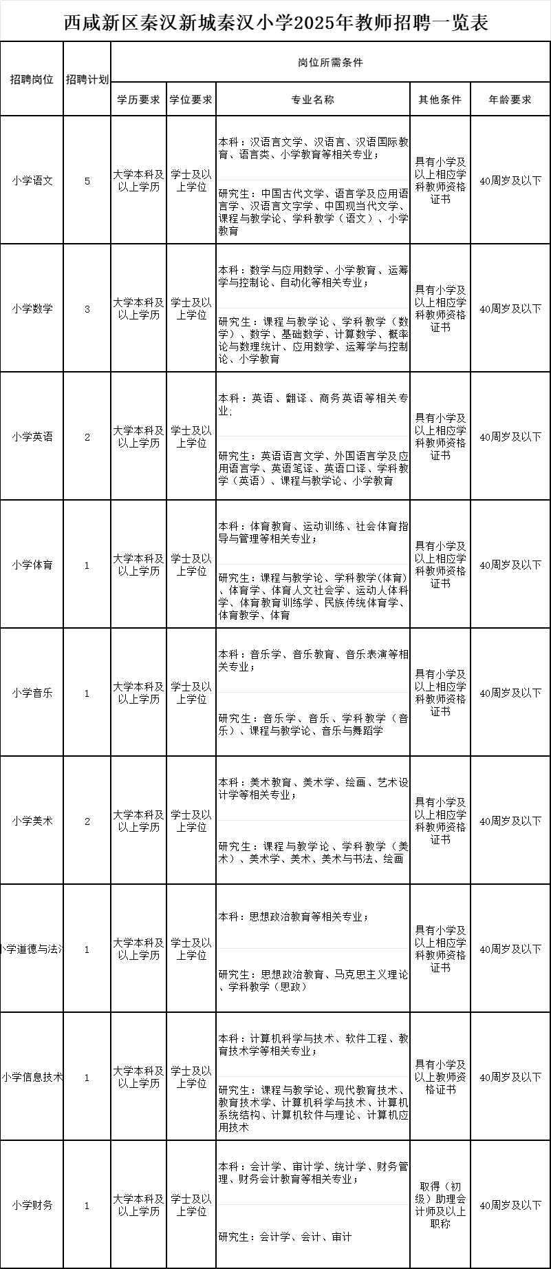 小學(xué)語文:5人、小學(xué)數(shù)學(xué):3人、小學(xué)英語:2人、小學(xué)體育:1人、小學(xué)音樂:1人、小學(xué)美術(shù):2人、小學(xué)道德與法治:1人 、小學(xué)信息技術(shù):1人、財務(wù):1人。
