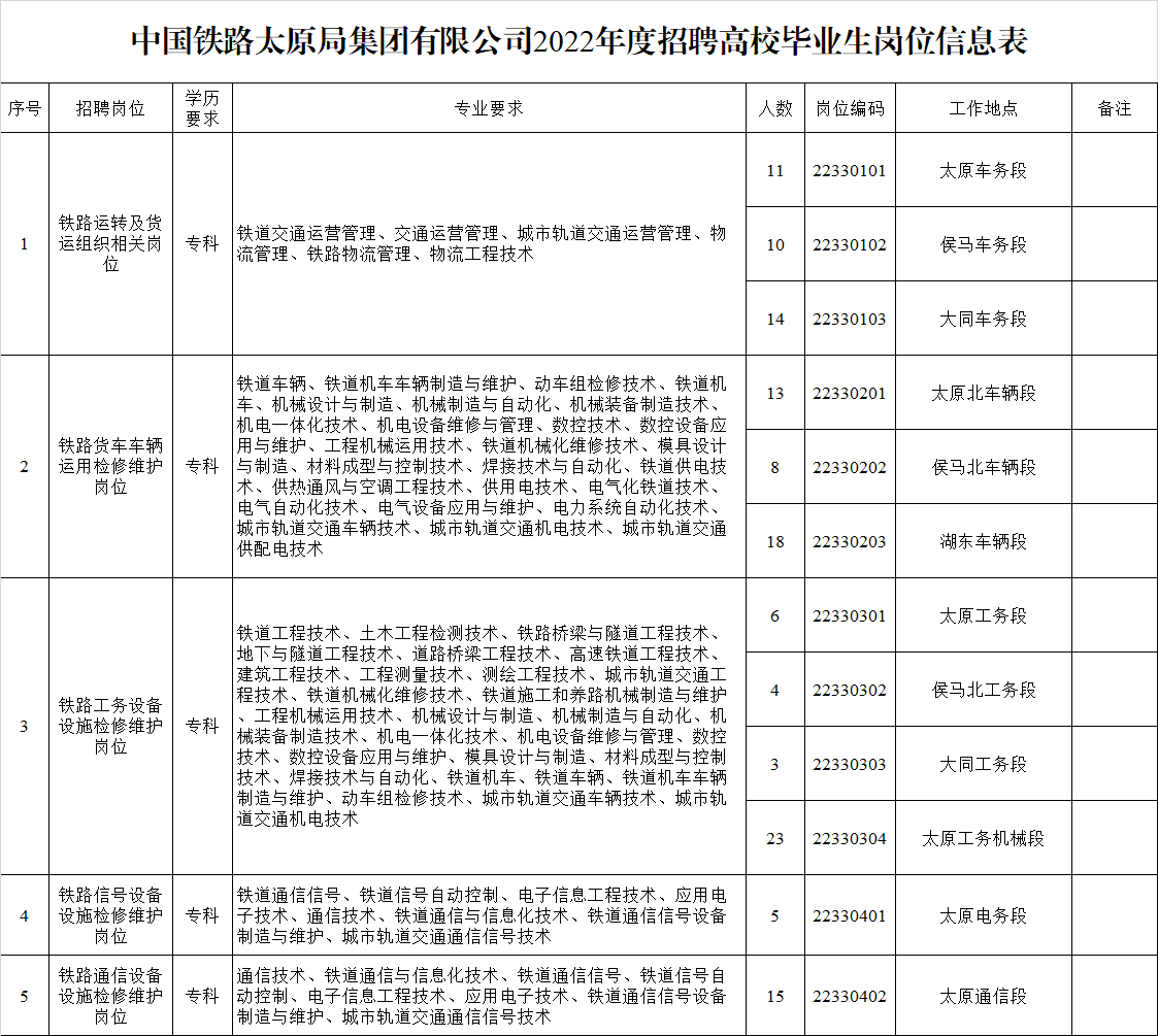 招聘崗位、學(xué)歷、專(zhuān)業(yè)、人數(shù)和工作單位等內(nèi)容詳見(jiàn)《中國(guó)鐵路太原局集團(tuán)有限公司2022年度招聘高校畢業(yè)生崗位信息表》。