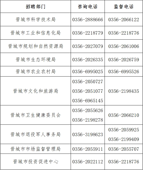 公開招聘期間,相關(guān)信息在以下網(wǎng)站進(jìn)行發(fā)布:晉城市人民政府網(wǎng)(http://www.jcgov.gov.cn/)、晉城市人力資源和社會保障局官網(wǎng)(http://rsj.jcgov.gov.cn)、“晉城人社”微信公眾號、晉城人才網(wǎng)(www.jcrcw.com)及各招聘單位主管部門網(wǎng)站。請考生隨時關(guān)注網(wǎng)上相關(guān)信息,公開招聘考試接受紀(jì)檢監(jiān)察、新聞媒體、社會各界的監(jiān)督,同時設(shè)立咨詢、監(jiān)督電話。