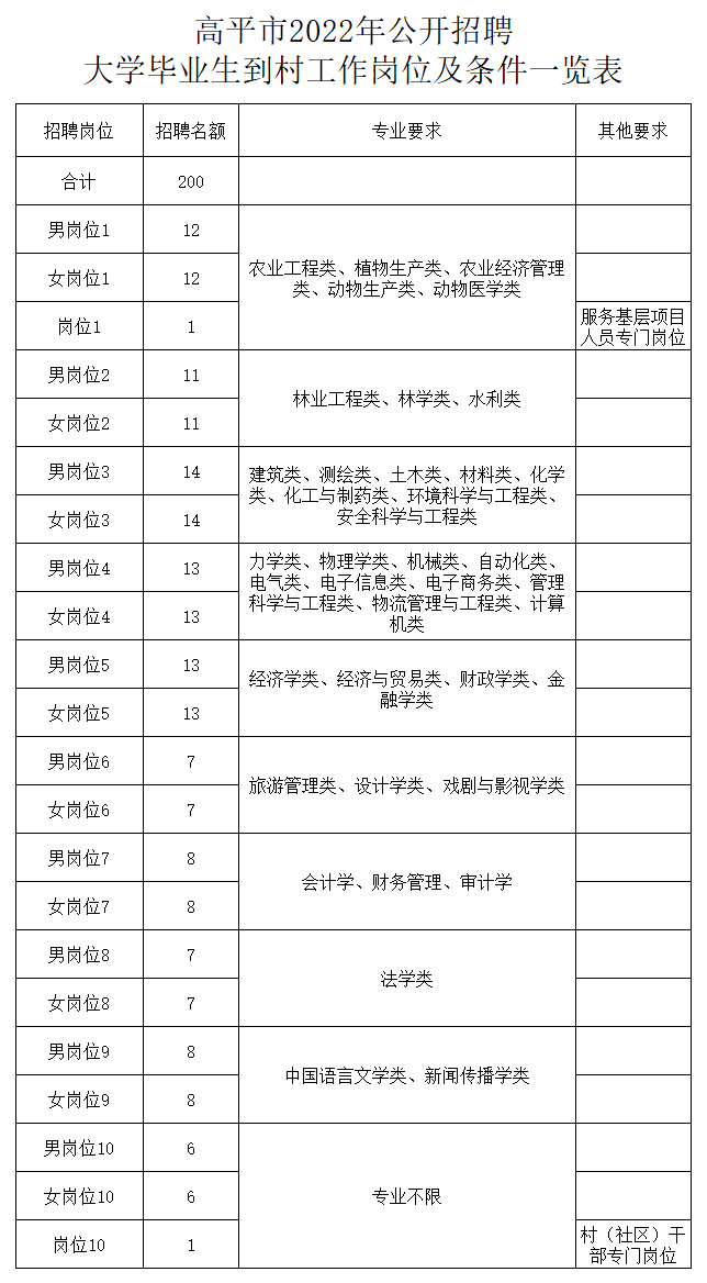 本次共招聘大學(xué)畢業(yè)生200名,全額事業(yè)編制,具體崗位及要求詳見《高平市2022年公開招聘大學(xué)畢業(yè)生到村工作崗位及條件一覽表》(附后)。