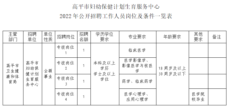 附件:高平市婦幼保健計(jì)劃生育服務(wù)中心2022年公開招聘工作人員崗位及條件一覽表