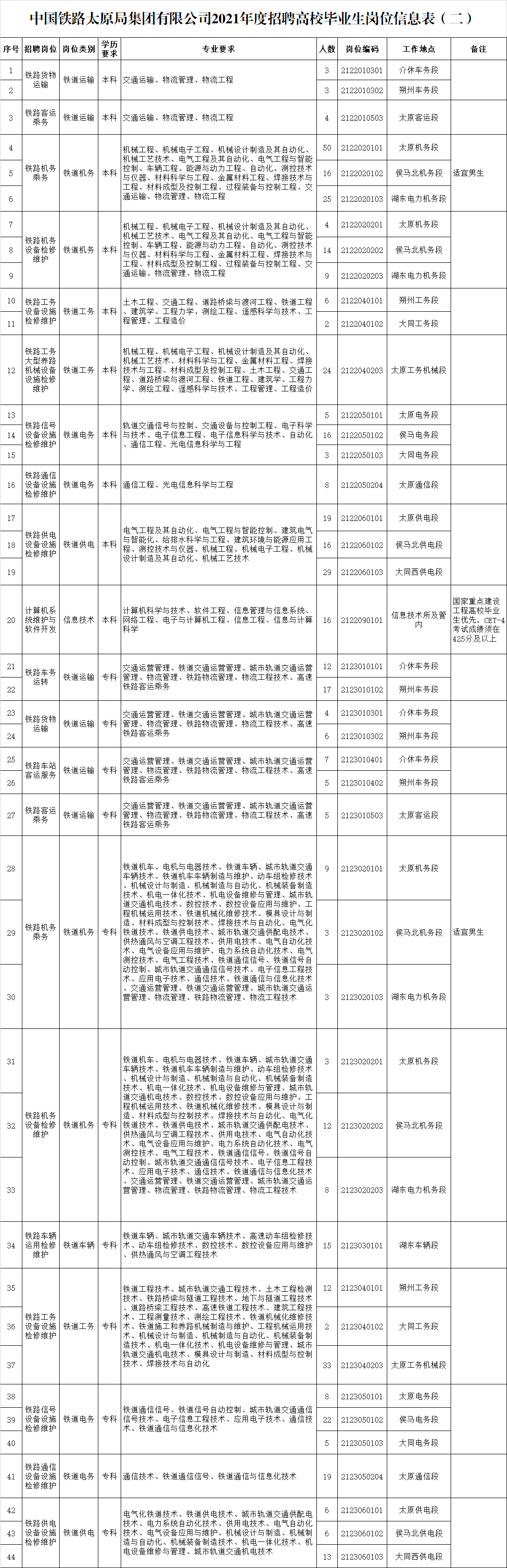 招聘崗位、學(xué)歷、專業(yè)、人數(shù)和工作地點(diǎn)等內(nèi)容詳見《中國鐵路太原局集團(tuán)有限公司2021年度招聘高校畢業(yè)生崗位信息表(二)》。