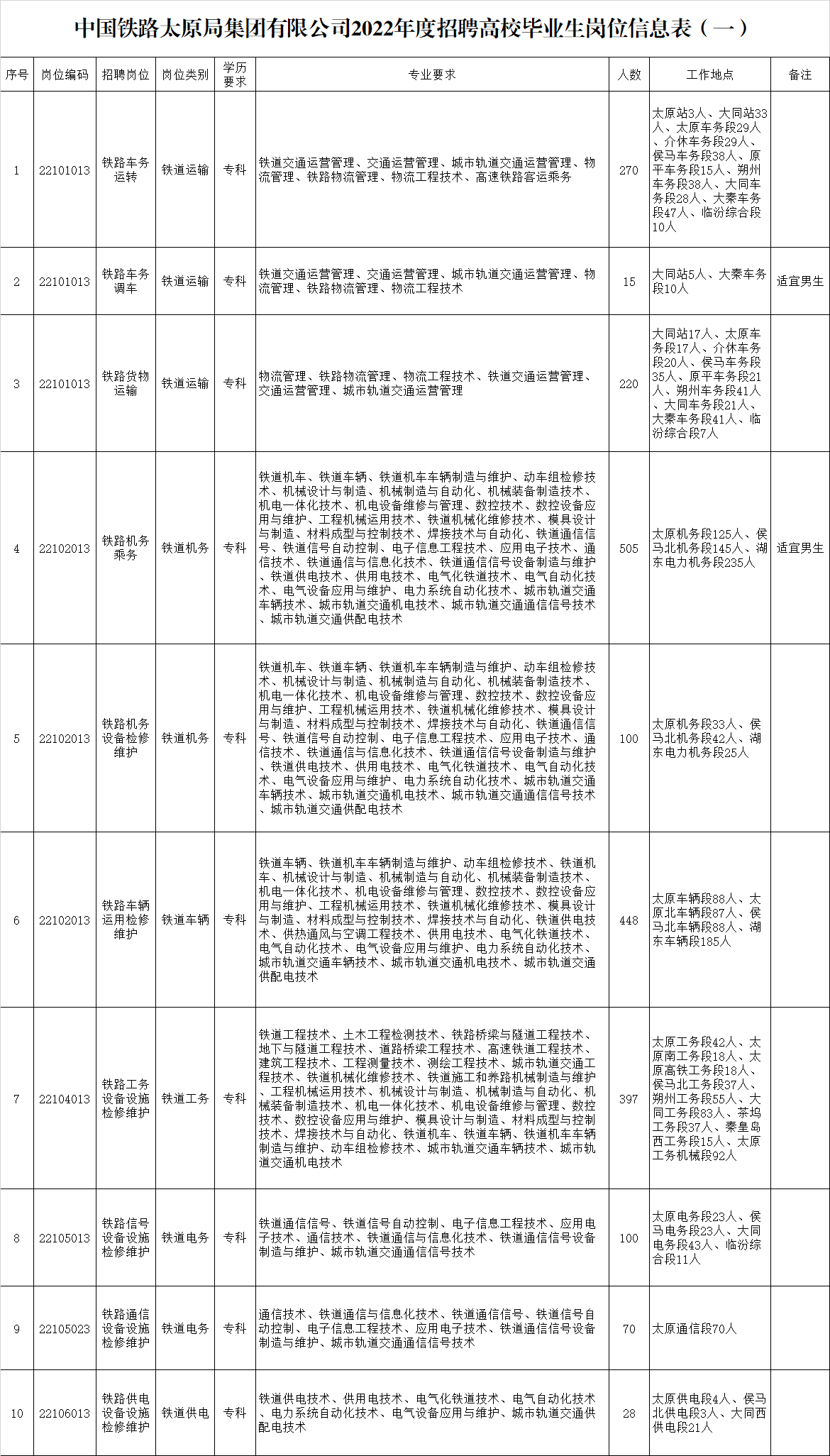 招聘崗位、學(xué)歷、專業(yè)、人數(shù)和工作地點(diǎn)等內(nèi)容詳見《中國鐵路太原局集團(tuán)有限公司2022年度招聘高校畢業(yè)生崗位信息表(一)》。