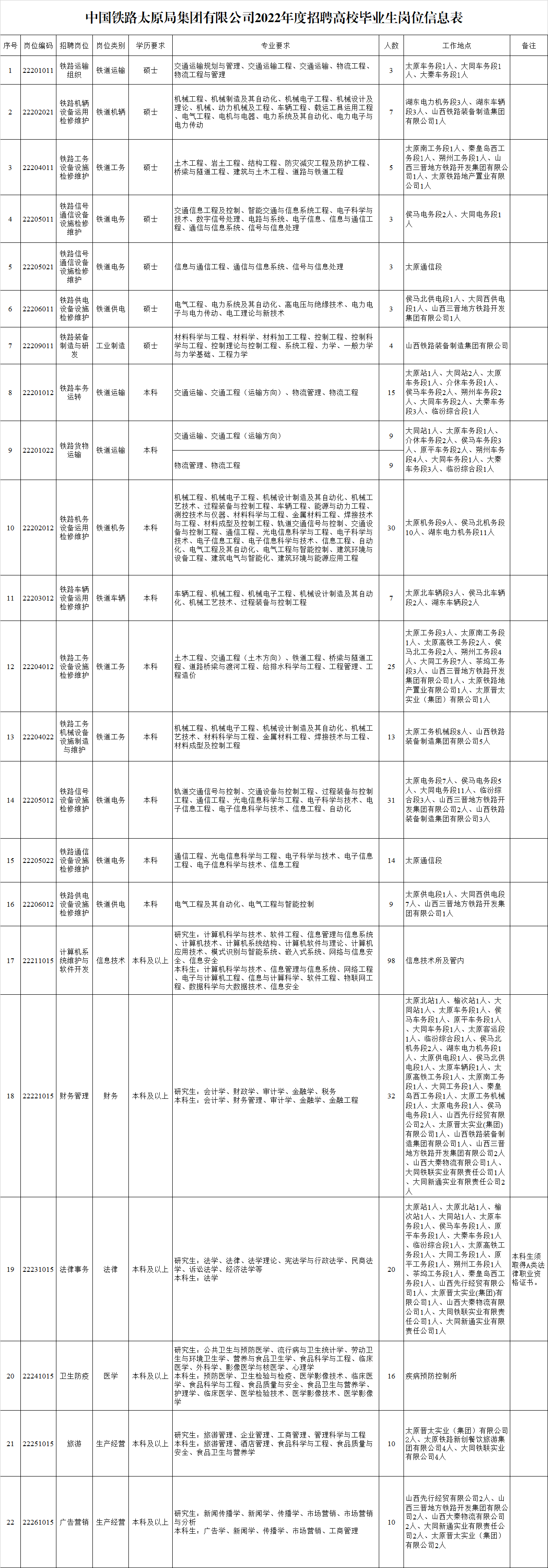 招聘崗位、學(xué)歷、專業(yè)、人數(shù)和工作地點等內(nèi)容詳見《中國鐵路太原局集團有限公司2022年度招聘高校畢業(yè)生崗位信息表》。