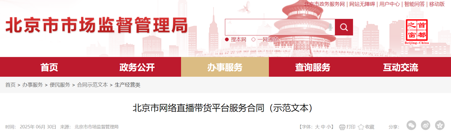 據(jù)北京市市場監(jiān)督管理局7月8日消息,北京市市場監(jiān)督管理局正式發(fā)布《北京市網(wǎng)絡(luò)直播帶貨平臺(tái)服務(wù)合同(示范文本)(試行)》。該文本系全國首個(gè) ...