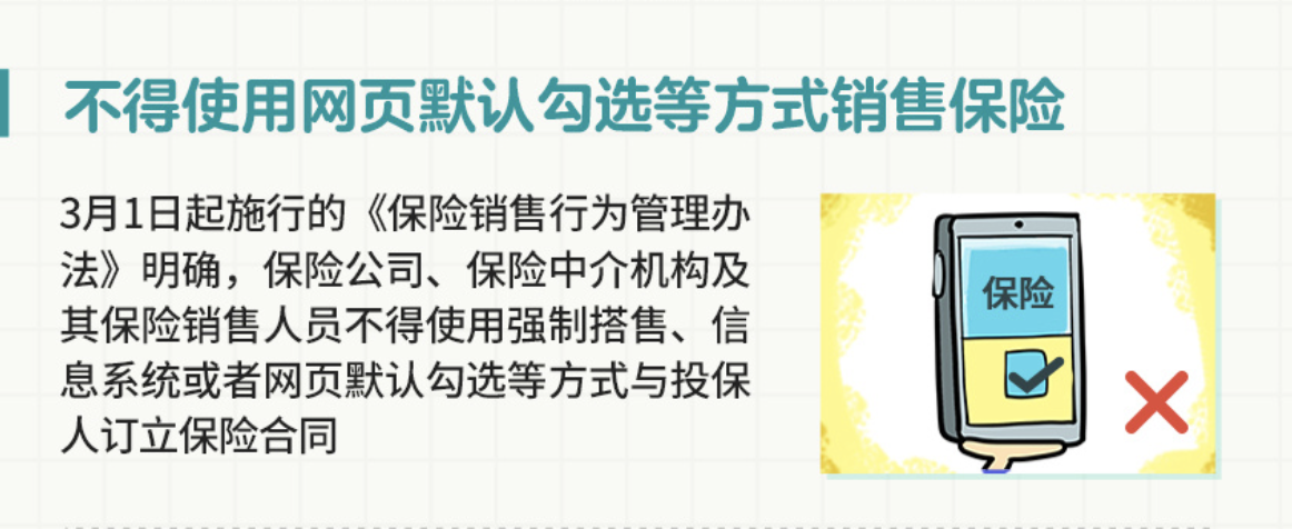 3月1日起施行的《保險銷售行為管理辦法》明確,保險公司、保險中介機構(gòu)及保險其保險銷售人員不得使用強制搭售、信息系統(tǒng)或者網(wǎng)頁默認(rèn)勾選等方式與投保人訂立保險合同。