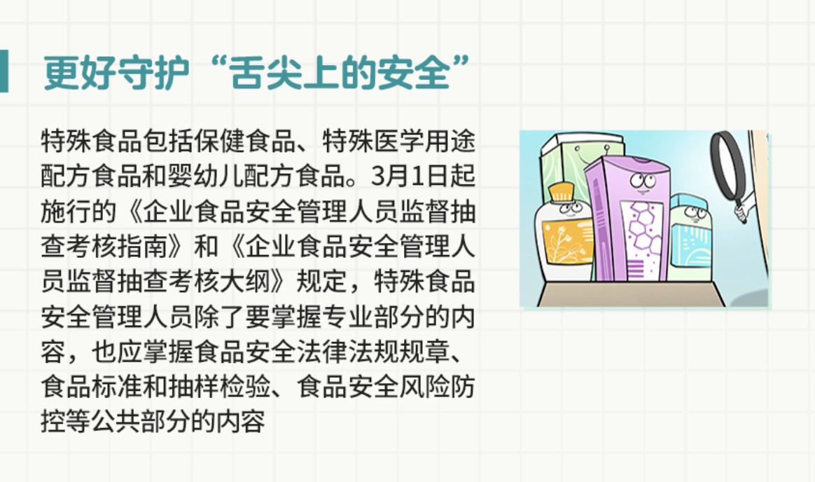 3月1日起施行的《企業(yè)食品安全管理人員監(jiān)督抽查考核指南》和《企業(yè)食品安全管理人員監(jiān)督抽查考核大綱》規(guī)定,特殊食品(注:特殊食品包括保健食品、特殊醫(yī)學(xué)用途配方食品和嬰幼兒配方食品)安全管理人員除了要掌握專業(yè)部分的內(nèi)容,也應(yīng)掌握食品安全法律法規(guī)規(guī)章、食品標(biāo)準(zhǔn)和抽樣檢驗、食品安全風(fēng)險防控等公共部分的內(nèi)容。