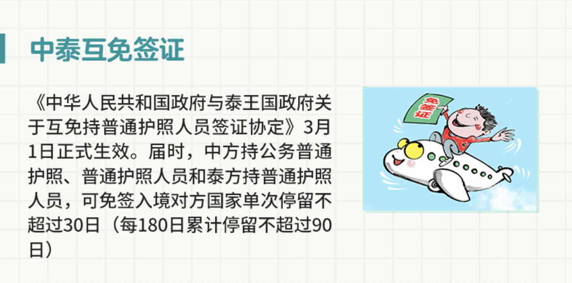 《中華人民共和國政府與泰王國政府關(guān)于互免持普通護照人員簽證協(xié)定》3月1日正式生效。屆時,中方持公務(wù)普通護照、普通護照人員和泰方持普通護照人員,可免簽入境對方國家單次停留不超過30日 (每180日累計停留不超過90日)。