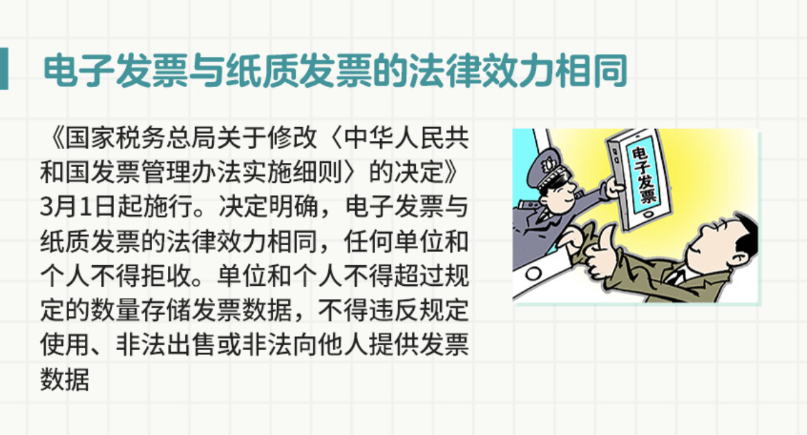 決定明確,電子發(fā)票與紙質(zhì)發(fā)票的法律效力相同,任何單位和個人不得拒收。單位和個人不得超過規(guī)定的數(shù)量存儲發(fā)票數(shù)據(jù),不得違反規(guī)定使用、非法出售或非法向他人提供發(fā)票數(shù)據(jù)。