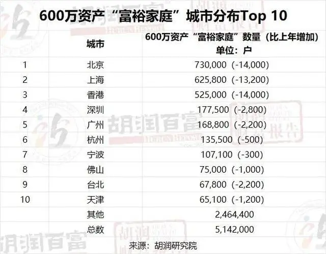 北京依然是擁有最多600萬元資產(chǎn)“富裕家庭”的地區(qū),比上年減少1.4萬戶至73萬戶,跌幅1.9%,其中擁有600萬元可投資資產(chǎn)的“富裕家庭”數(shù)量有27.6萬戶;廣東第二,600萬元資產(chǎn)“富裕家庭”比上年減少1.6萬戶,達(dá)到70.1萬戶,跌幅2.3%,其中擁有600萬元可投資資產(chǎn)的“富裕家庭”數(shù)量有25.8萬戶;上海第三,600萬元資產(chǎn)“富裕家庭”比上年減少1.3萬戶至62.6萬戶,跌幅2.1%,其中擁有600萬可投資資產(chǎn)的“富裕家庭”數(shù)量有22.3萬戶;浙江第四,600萬元資產(chǎn)“富裕家庭”比上年減少1,500戶至55.1萬戶,跌幅0.3%,其中擁有600萬元可投資資產(chǎn)的“富裕家庭”數(shù)量有19.7萬戶;香港第五,600萬元資產(chǎn)“富裕家庭”比上年減少1.4萬戶至 52.5萬戶,跌幅2.6%,其中擁有600萬元可投資資產(chǎn)的“富裕家庭”數(shù)量有18.2萬戶。