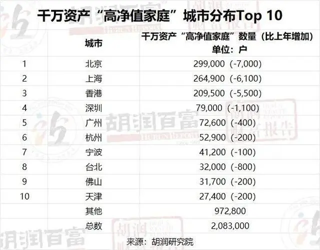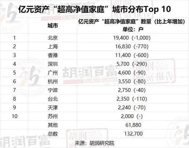 北京仍然是擁有最多億元資產(chǎn)“超高凈值家庭”的地區(qū),比上年減少1000戶至19,400戶,減少4.9%,其中擁有億元可投資資產(chǎn)的“超高凈值家庭”數(shù)量有11400戶;廣東第二,億元資產(chǎn)“超高凈值家庭”比上年減少840戶至17300戶,減少4.6%,其中擁有億元可投資資產(chǎn)的“超高凈值家庭”數(shù)量有10,500戶;上海第三,億元資產(chǎn)“超高凈值家庭”比上年減少770戶至16830戶,減少4.4%,其中擁有億元可投資資產(chǎn)的“超高凈值家庭”數(shù)量有10210戶;浙江第四,億元資產(chǎn)“超高凈值家庭”比上年減少500戶至13800戶,減少3.5%,其中擁有億元可投資資產(chǎn)的“超高凈值家庭”數(shù)量有8,370戶;香港第五,億元資產(chǎn)“超高凈值家庭”比上年減少600戶,達(dá)到11400戶,減少5.0%,其中擁有億元可投資資產(chǎn)的“超高凈值家庭”數(shù)量有6760戶。
