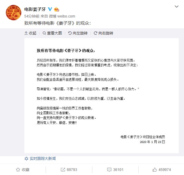 《姜子牙》等兩部電影官宣因疫情退出春節(jié)檔