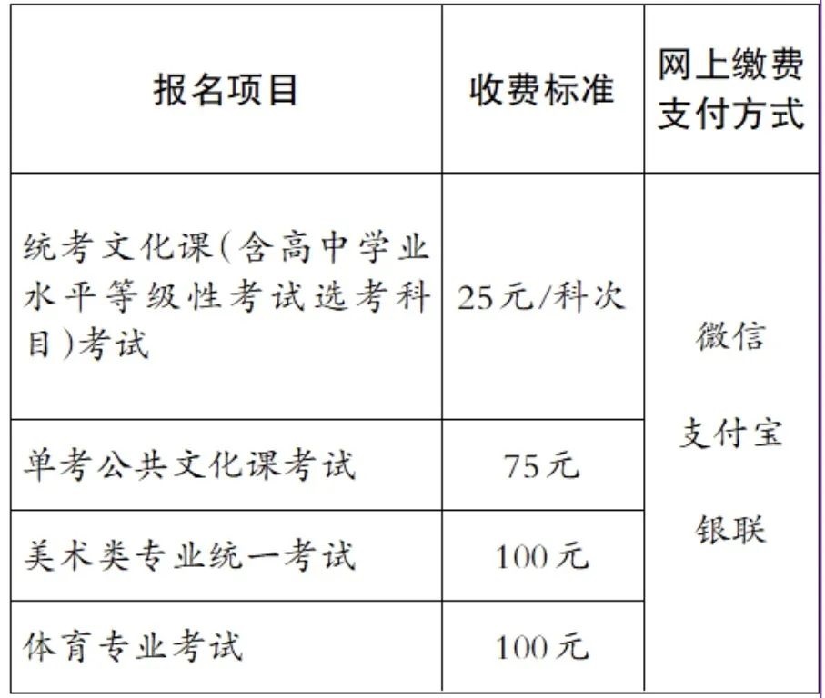 不同報名項目費用有所不同,其中統(tǒng)考文化課(含高中學業(yè)水平等級性考試選考科目)考試為每科次25元,單考公共文化課考試報名費為75元,美術(shù)類專業(yè)統(tǒng)一考試和體育專業(yè)考試兩項目報名費各為100元。
