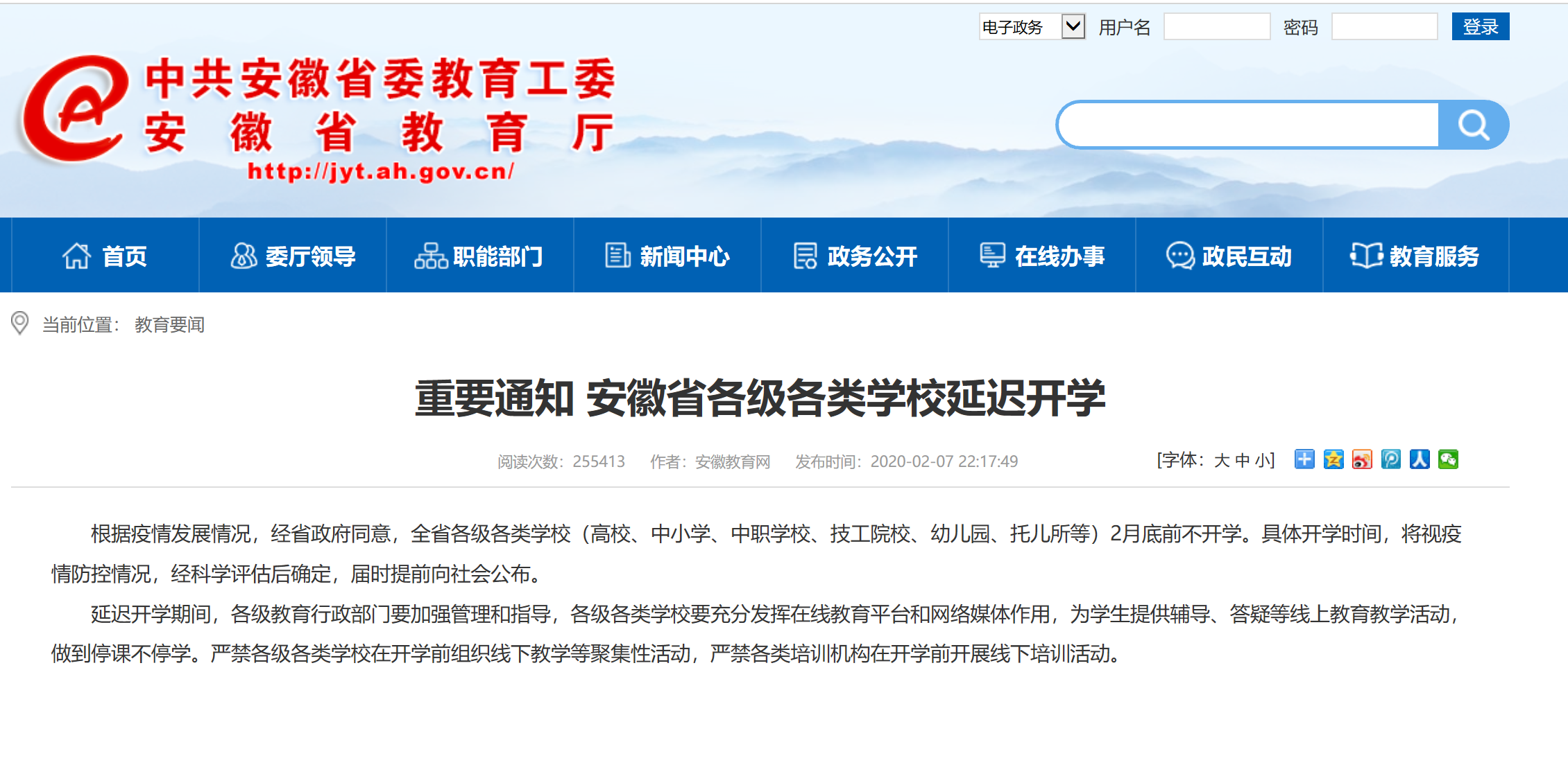重要通知:安徽省各級各類學(xué)校延遲開學(xué)