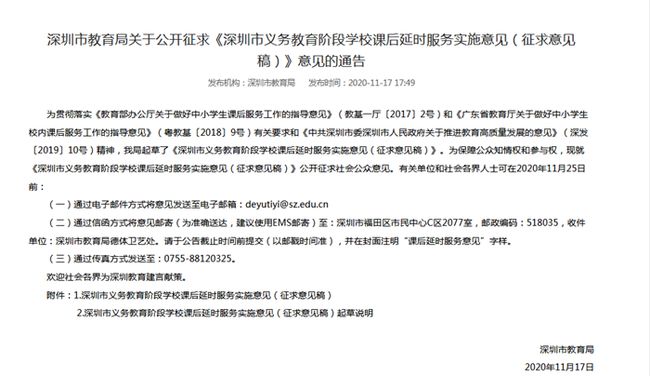 11月17日,深圳市教育局發(fā)布了《深圳市義務(wù)教育階段學(xué)校課后延時(shí)服務(wù)實(shí)施意見(征求意見稿)》(以下簡(jiǎn)稱《實(shí)施意見》),擬對(duì)課后延時(shí)服務(wù)做一些新的規(guī)定。
