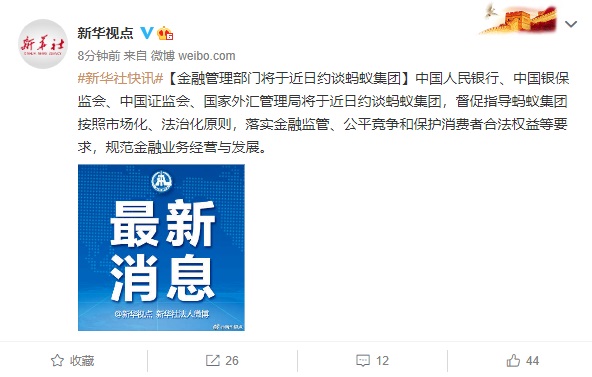 據(jù)新華視點報道,中國人民銀行、中國銀保監(jiān)會、中國證監(jiān)會、國家外匯管理局將于近日約談螞蟻集團,督促指導螞蟻集團按照市場化、法治化原則,落實金融監(jiān)管、公平競爭和保護消費者合法權(quán)益等要求,規(guī)范金融業(yè)務(wù)經(jīng)營與發(fā)展。