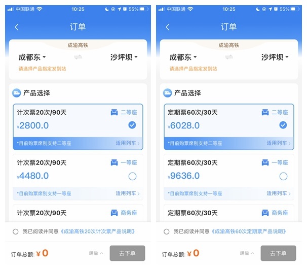 而成渝高鐵普通票商務(wù)座價(jià)格在 460-495 元之間,一等座在 250 元左右,二等座在 150 元左右。如果足額利用乘車次數(shù),相較于二等座最貴的 168 元票價(jià),一張定期票可以節(jié)省原價(jià)的 40% 。